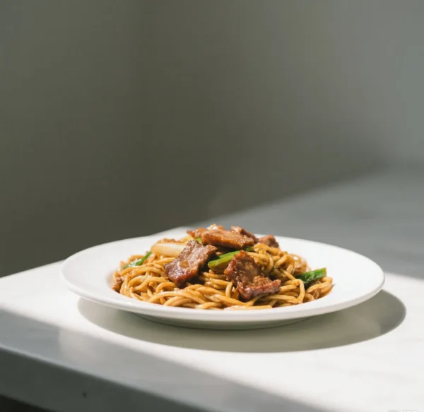 🍜 Savory slices of roast pork stir-fried with crispy noodles, cabbage, onions, and bean sprouts in a flavorful soy-based sauce.