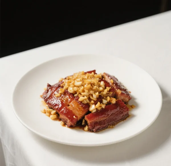 🍖 Sliced roast pork stir-fried with broccoli, carrots, and bell peppers in a spicy, garlicky brown sauce.